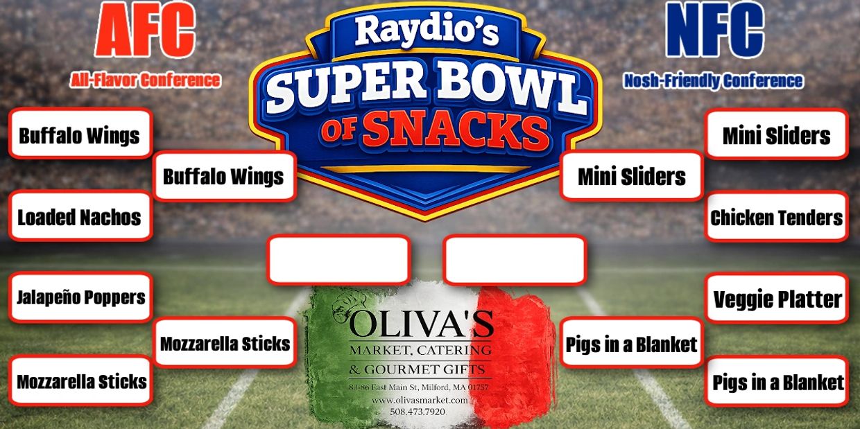 Must be 18 or older to play. Oliva’s Market, Catering & Gourmet Gifts will choose the catering menu. Raydio will deliver the food and TV on the day of the Big Game.